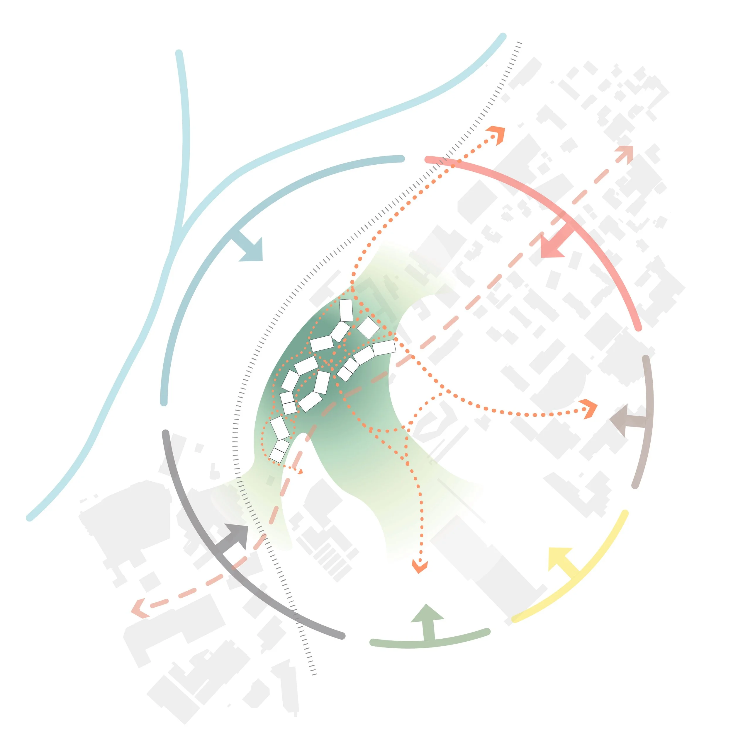 The Rienz-Höfe creates a dynamic urban ecosystem at Bruneck's southern entrance, forming a vital connection between the city and surrounding landscape. Our design follows the flowing movements of the nearby Rienz river, establishing an open, permeable neighborhood that harmoniously integrates with its environment while creating distinctive community spaces. The development is organized around semi-private courtyards and public pathways, with clear sight lines and connections to neighboring districts that emphasize its open character.